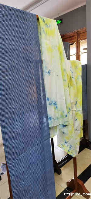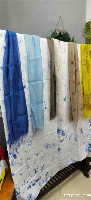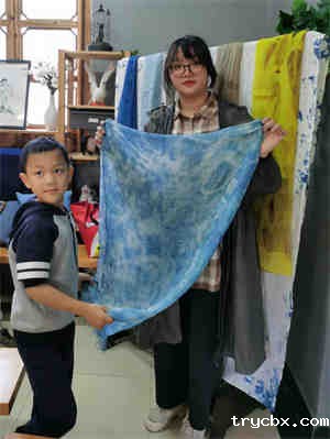 被橡皮筋扎缠的部分末受色,呈现出空心状的白布色,是"花";其余部分成深蓝色,即是"地",便出现蓝底白花的图案花纹来,至此,一块漂亮的扎染围巾就完成了。青白二色的结合往往给人以“青花瓷”般的淡雅之感,而平和与宽容更体现在扎染的天空中。请欣赏我们的作品!