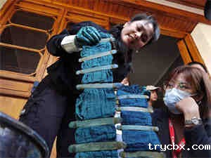 完成扎花后就是浸染了,在老师的帮助下将扎好"疙瘩"的围巾先用清水浸泡,再放入染缸里,浸泡冷染,经一定时间后捞出,刚刚染好的围巾拿出来是青绿色的,与空气接触后发生氧化而变成蓝色,然后再将布料放入染缸浸染,如此反复,每浸一次色深一层,即所谓"青出于蓝"。