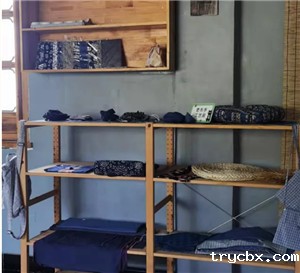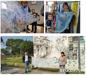 完成扎花后就是浸染了,在老师的帮助下将扎好"疙瘩"的围巾先用清水浸泡,再放入染缸里,浸泡冷染,经一定时间后捞出,刚刚染好的围巾拿出来是青绿色的,与空气接触后发生氧化而变成蓝色,然后再将布料放入染缸浸染,如此反复,每浸一次色深一层,即所谓"青出于蓝"。