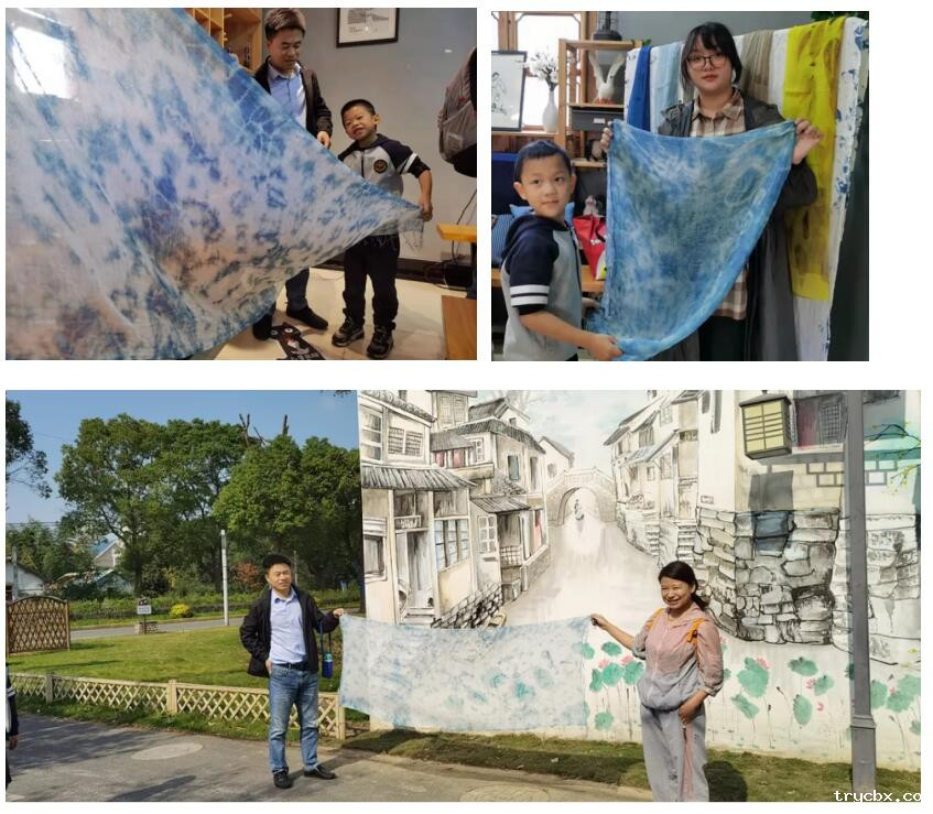 被橡皮筋扎缠的部分末受色,呈现出空心状的白布色,是"花";其余部分成深蓝色,即是"地",便出现蓝底白花的图案花纹来,至此,一块漂亮的扎染围巾就完成了。青白二色的结合往往给人以“青花瓷”般的淡雅之感,而平和与宽容更体现在扎染的天空中。请欣赏我们的作品!